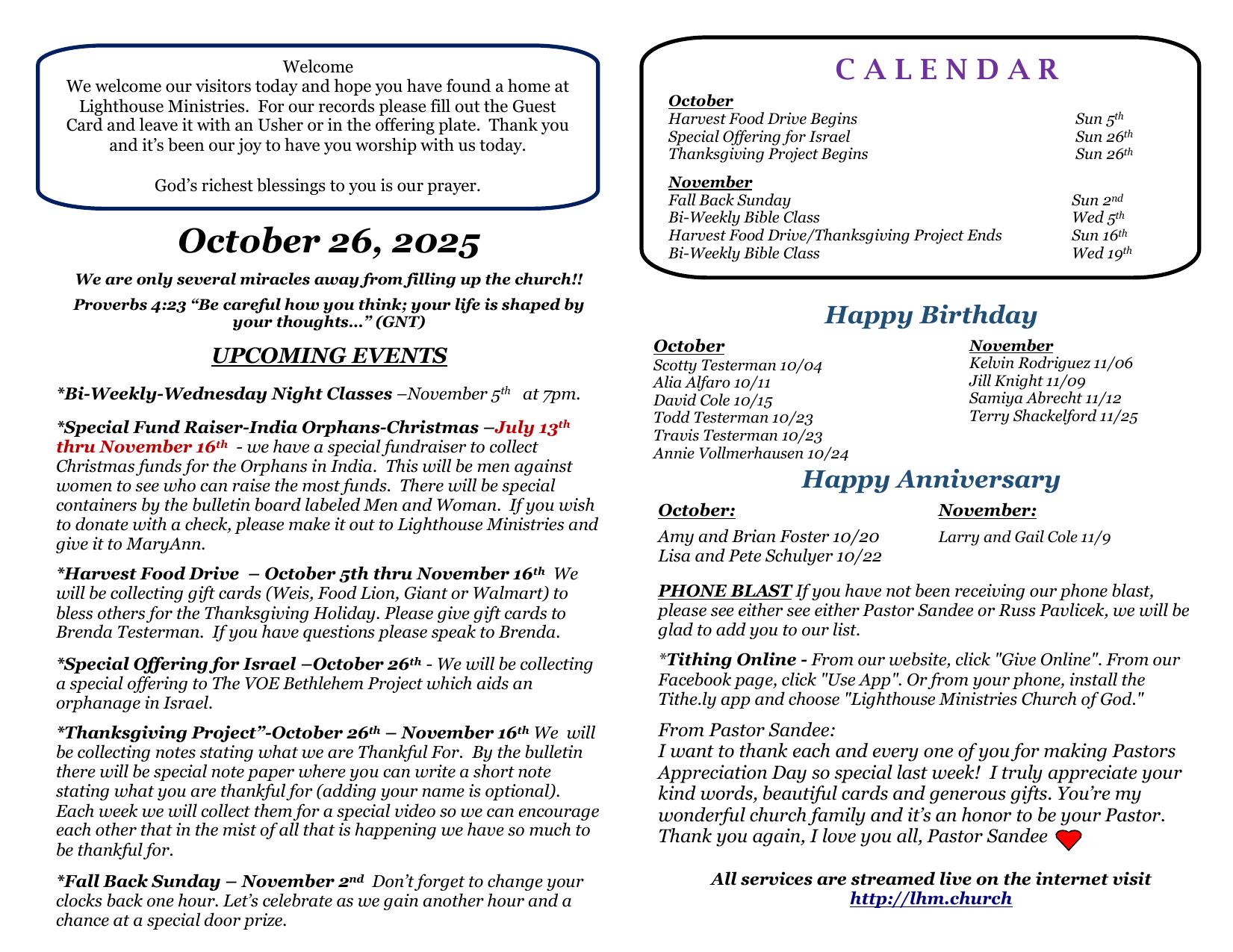 Along with our weekly bulletin below, check out our announcement page for online attendees to stay up to date with the activities at the church.