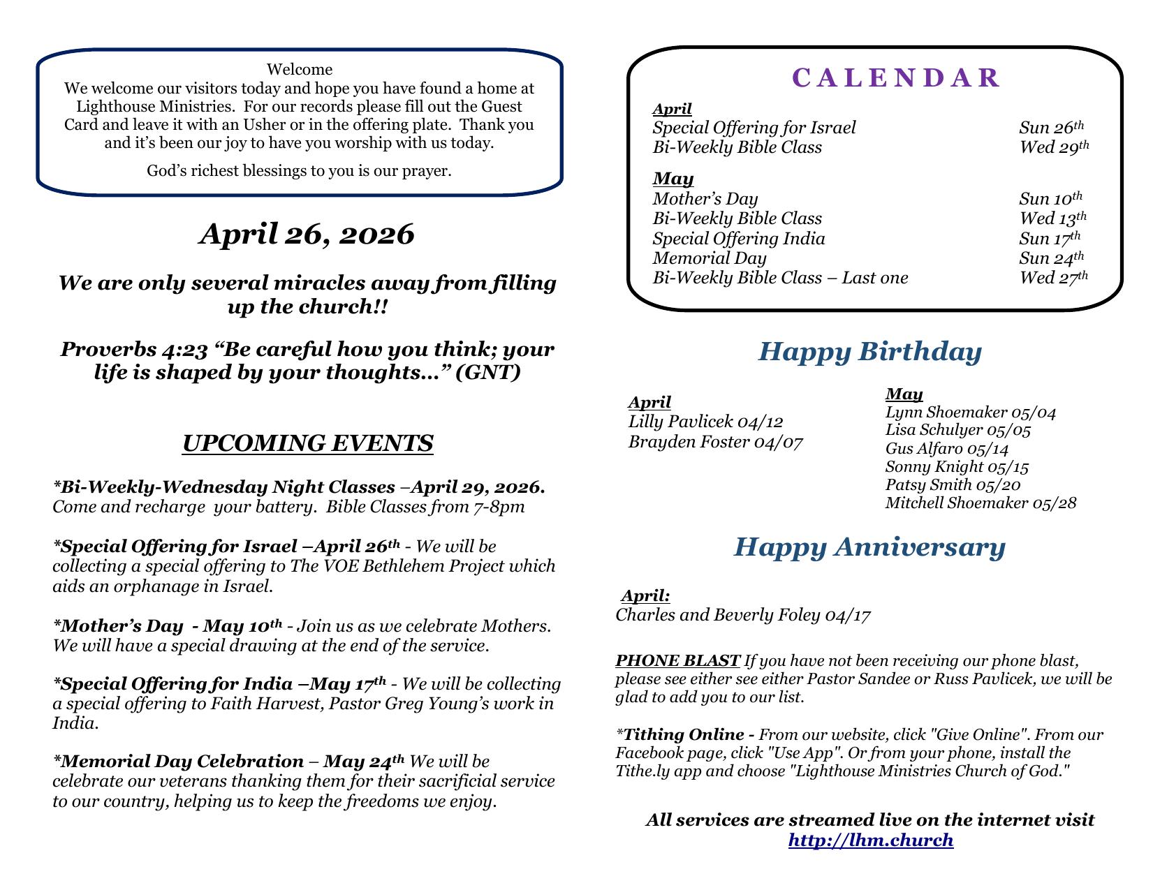 Sunday: 10:30 AM ET CHURCH (& ONLINE) -- BIBLE STUDY Wednesdays (see events)
